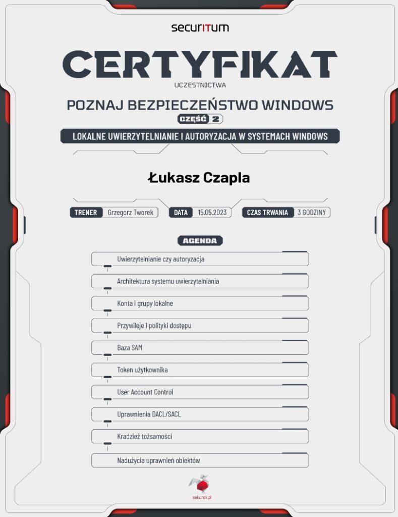 Dzięki wiedzy zdobytej na szkoleniu poznałem lepiej mechanizmy zabezpieczeń oraz zagrożenia wynikających z niewłaściwego zarządzania kontami i uprawnieniami w systemach Windows. Jak zawsze polecam szkolenia od Sekurak 😉