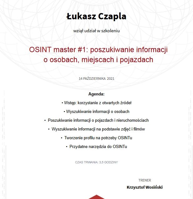 W październiku 2021 wziąłem udział szkoleniu w Securitum IT / Sekurak z zakresu pozyskiwania danych z internetu przy użyciu metod i narzędzi OSINT (Open-Source Inteligence), które gorąco polecam.