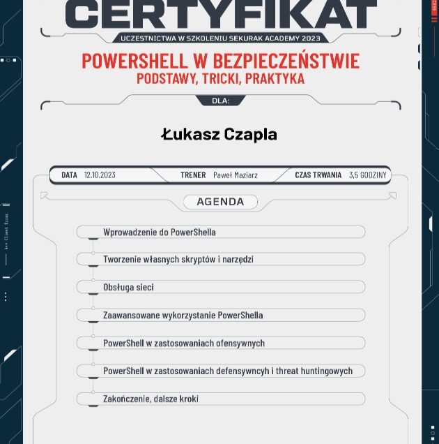 Pokazano, jak wykorzystywać PowerShell do tworzenia własnych skryptów, obsługi sieci oraz analizy zagrożeń. Kurs pokazał, jak narzędzie to może być używane ofensywnie – jako wsparcie dla testów penetracyjnych i symulacji ataków, oraz defensywnie – jako element systemów obronnych i narzędzie do wykrywania zagrożeń (threat hunting).